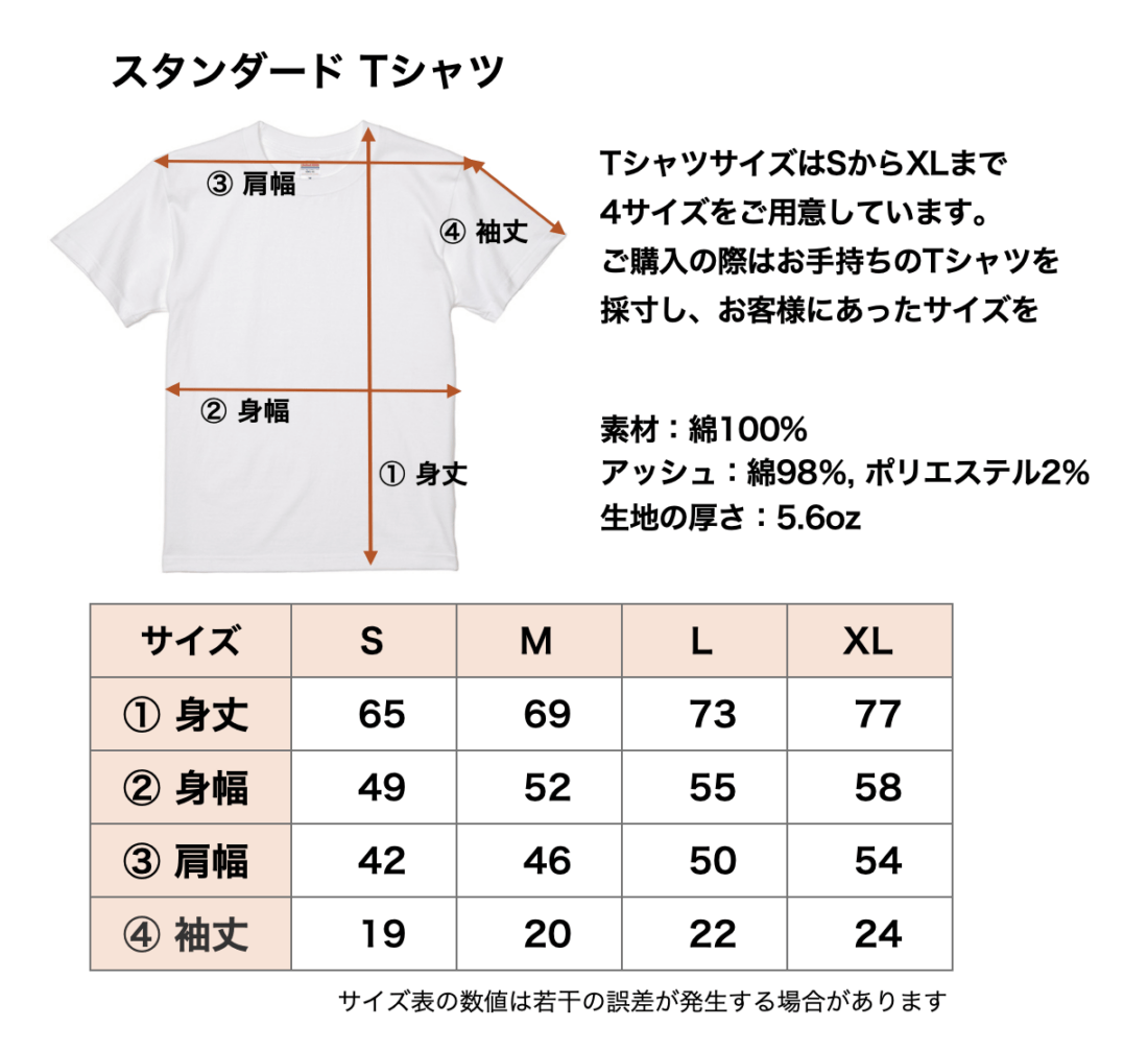 誰が着ても、バランスが良くなるように仕上げられたスタンダードなTシャツです。5.6ozで気持ちよく着れる平均的な厚さ。リングスパン糸という、しめ縄のように紡がれた糸を使っているので、意図の表面はなめらかなのに強度があり、柔らかい肌触りが特徴です。