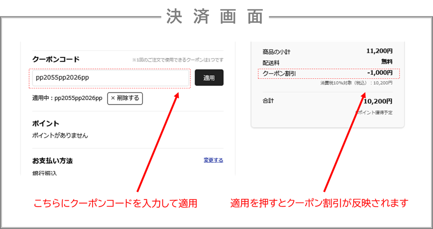 2.決済画面のクーポンコード欄にクーポンコード入力